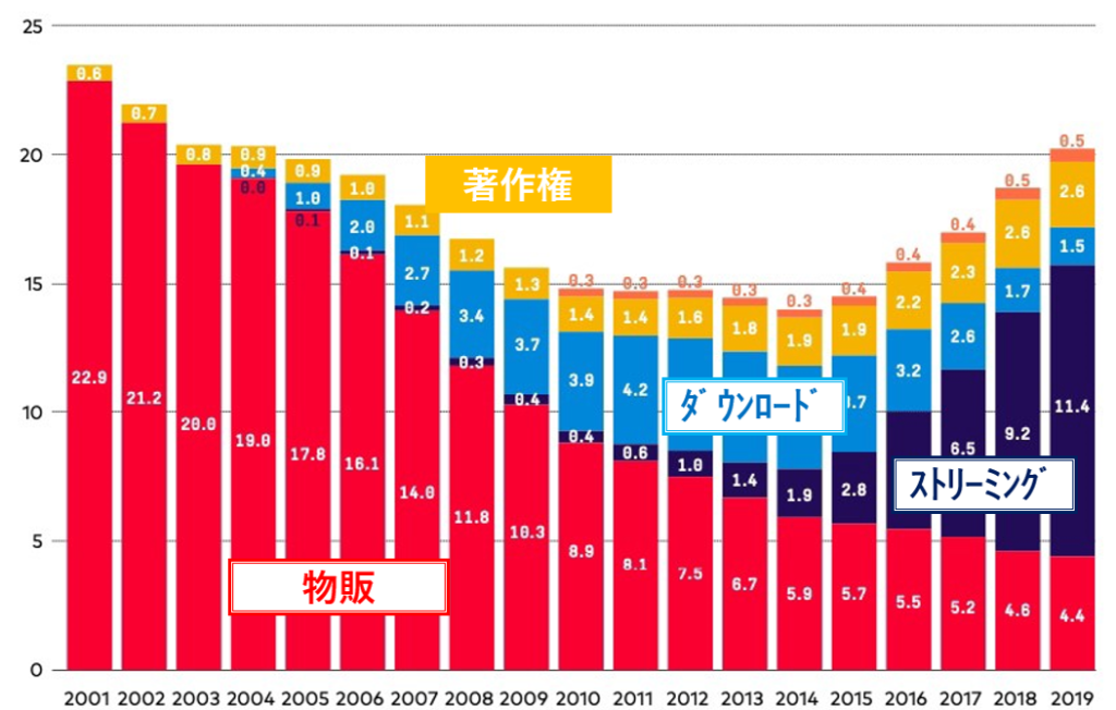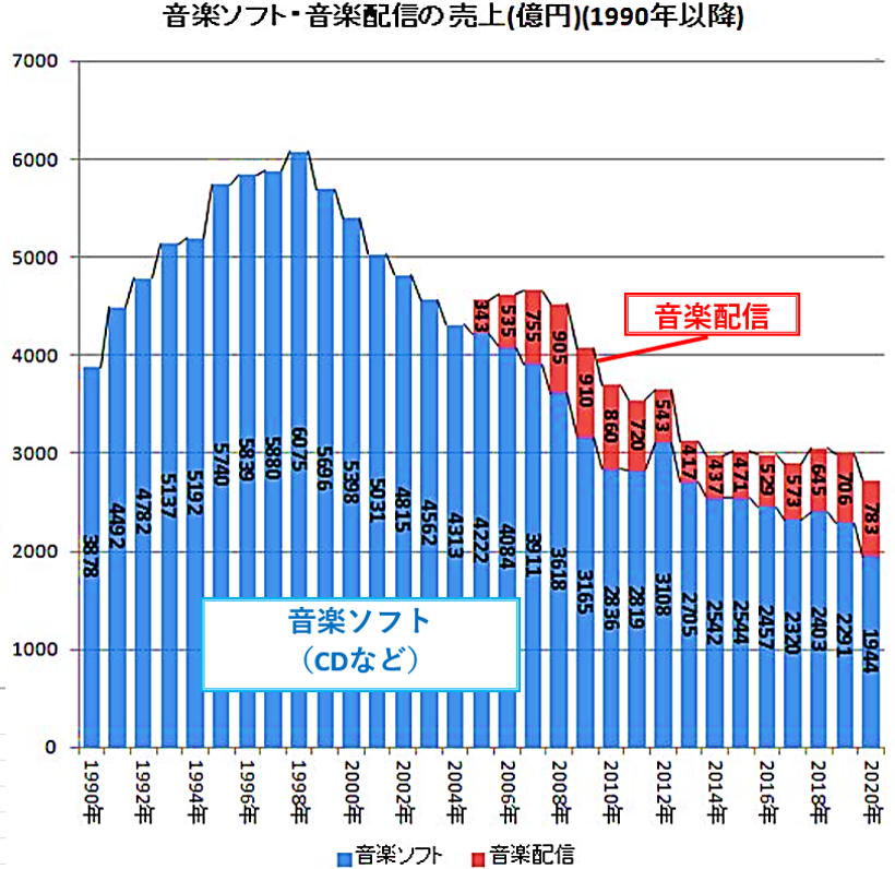 youtubeによる視聴など利用者の有料音楽との付き合い方の激変によって、CDなどの音楽ソフト売上は急速に縮小しています。