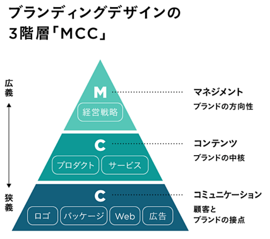 ブランディングデザインとは、この【M】マネジメント、【C】コンテンツ、【C】コミュニケーション、に縦串を通して整合させることを示しています。