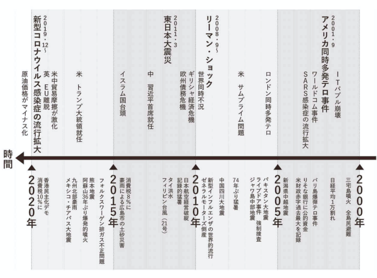 下の図は2000年からの20年間で世界的に影響を与えた出来事です。