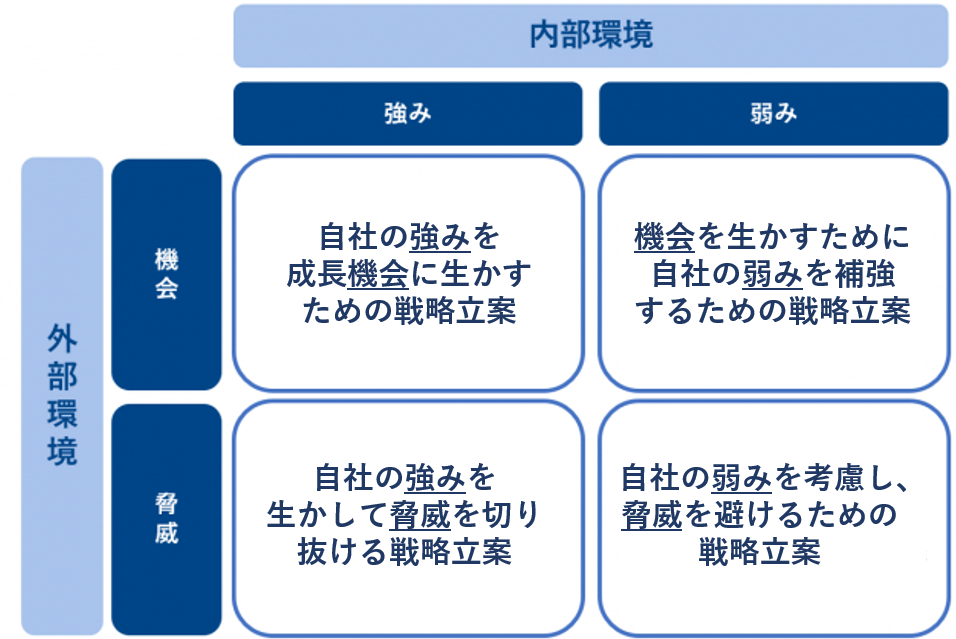 自らが抱える「内部環境」と、市場の状況や競合他社の存在といった「外部環境」の要素をプラス面とマイナス面に分け、それぞれ分析を行います。
